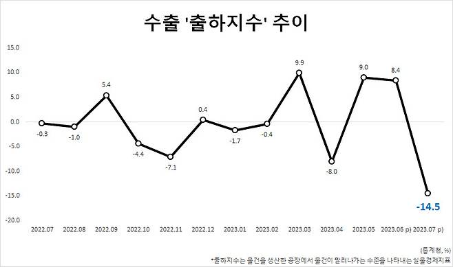 이에 따라 제조업 수출 출하는 전월대비 14.5% 감소했다. 1987년 8월 15% 감소한 이후 35년 11개월만에 최대 폭으로 격감했다.