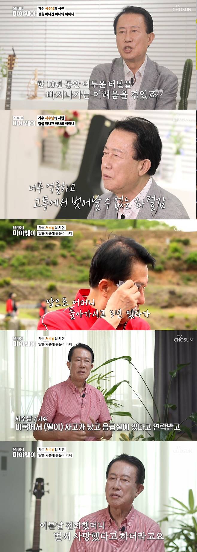 서수남은 "어머니가 세상을 떠난 후부터 딸 아이를 세상을 떠나면서 나한테는 알게 모르게 고독병, 우울증이 자주 발병한 거 같다. 누구를 만나든 좋은 일만 있는 것도 아니고 나쁜 일만 있는 것도 아니다. 때로는 사람들한테 위로 받고 싶고 누군가에겐 위로를 해주는 사람이 필요할 거 같다"고 마음의 병으로 괴로워했던 나날을 털어놨다.