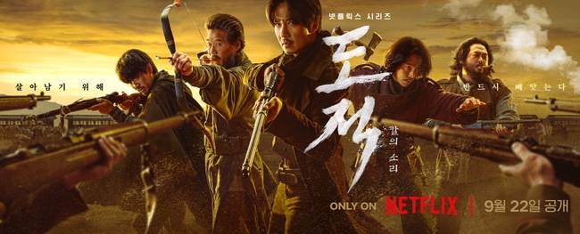 넷플릭스 '도적: 칼의 소리' 측은 9월 4일 인물들의 진한 서사를 담은 보도 스틸을 공개했다. 이번 작품은 1920년 중국의 땅, 일본의 돈, 조선의 사람이 모여든 무법천지의 땅 간도에서 소중한 사람들과 삶의 터전을 지키기 위해 하나 된 이들이 벌이는 과정을 다룬 액션 활극이다.
