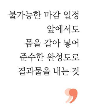 “불가능한 마감 일정 앞에서도 몸을 갈아 넣어 준수한 완성도로 결과물을 내는 것, 그게 바로 K-정신 아니겠습니까. 매번 기적을 일으키는 사즉생 정신!”