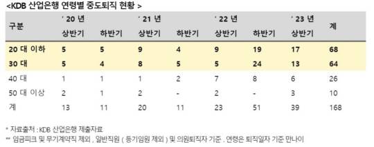 국회 정무위원회 황운하 의원(더불어 민주당,대전 중구)이 KDB산업은행으로부터 제출받은 자료를 보면 '20년 이후 올 상반기까지 168명이 중도 퇴사한 것으로 집계됐다.