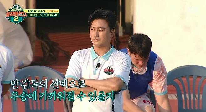 게다가 박제언의 논스톱 슈팅으로 한 번 더 골문을 흔들며 2 대 0으로 점수 차를 벌려 ‘뭉쳐야 찬다’ 시즌 통틀어 제일 행복해 보이는 안정환 감독의 표정을 볼 수 있었다. 그러나 이장군의 파울로 상대에게 프리킥 골을 허용하며 2 대 1로 전반전을 마쳤다.