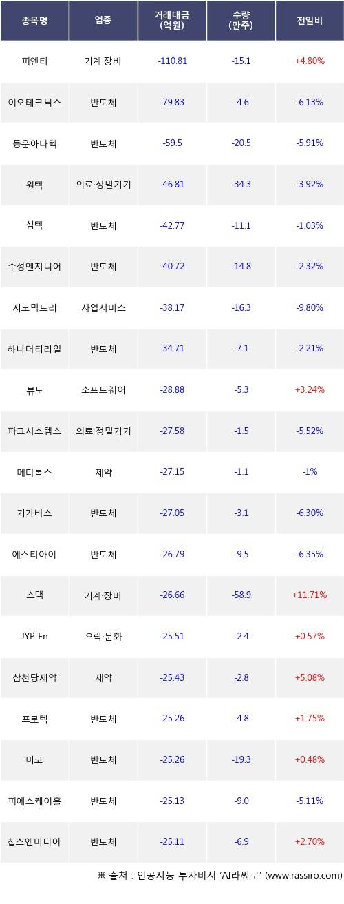 외국인 투자자의 순매도 상위 20개 종목은 피엔티, 이오테크닉스, 동운아나텍, 원텍, 심텍, 주성엔지니어링, 지노믹트리, 하나머티리얼즈, 뷰노, 파크시스템스등이다.