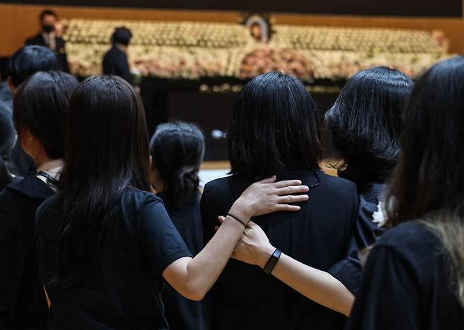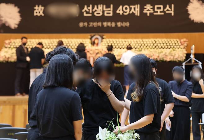 | ▲ 4일 오후 서울 서초구 서이초등학교 대강당에서 서울시 교육청 주최로 열린 서이초 교사의 ‘49재 추모제’에 동료 교사들이 서로를 위로하고 있다. |