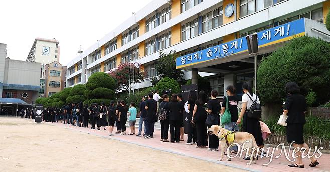 | ▲ 서이초 교사 49재를 맞은 4일 오후 서초구 서이초에서 교사와 시민들이 교실과 가까운 곳에 마련된 추모장소에 헌화하기 위해 길게 줄을 서 기다리고 있다. |