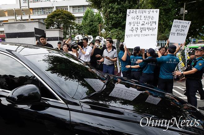 4일 오후 서울 서초구 서이초 강당에서 진행된 사망 교사 49재 추모제 참석 후 떠나는 이주호 교육부장관 뒤로 교사들의 분노가 쏟아졌다. 이 장관이 탄 차가 교문을 빠져나가자 전국교직원노동조합(전교조) 소속 교사들은 "부당한 교사징계 (추진을) 즉각 철회하라", "정당한 권리를 탄압하지 말라"고 적힌 손팻말을 들고 항의했다.