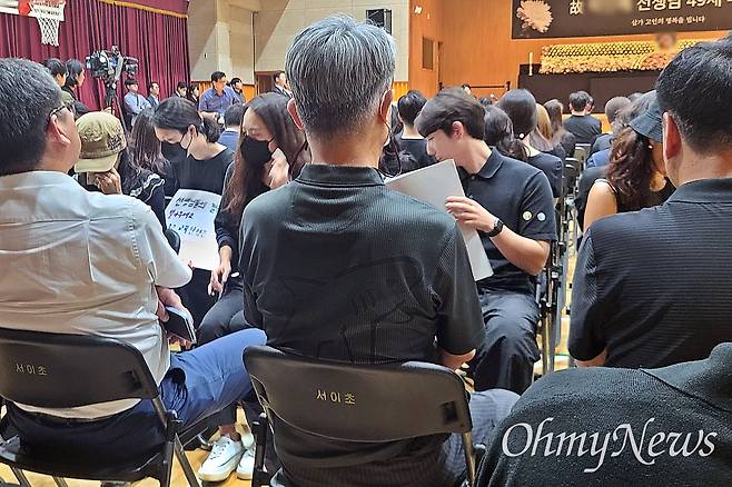 서이초 교직원을 대표해 추도사를 낭독한 이아무개씨는 "평생 함께하고픈 친구 한 명 만들기 어려운 이 세상에서 OO(고인)아, 너를 동기로 만나 너무나 감사하고 행복했다"고 깊은 숨을 내쉬며 운을 뗐다.