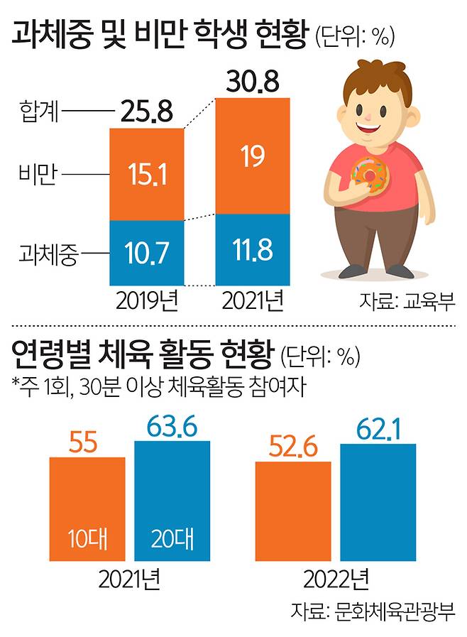 문화체육관광부의 ‘2022년 국민생활체육조사’에 따르면 지난해 10대 청소년의 생활체육 참여(일주일에 1회·30분 이상 운동) 비율은 52.6%에 불과하다. 2021년(55%)보다 2.4%포인트 줄어든 수치다. 10대 절반은 일주일에 30분도 운동하지 않는 셈이다. 이는 모든 연령대에서 가장 낮다. 70대 이상 노년층(54.3%)보다도 10대의 체육 활동이 부족할 정도다.
