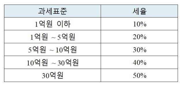 현행 상속세 및 증여세법(상증세법)에 따른 상속 및 증여에 대한 과세표준 및 세율(상속세율)은 다음과 같다.