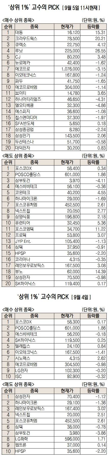 이날 미래에셋엠클럽에 따르면 미래에셋증권 주식 거래 고객 중 최근 1개월 간 투자수익률 상위 1%에 해당하는 ‘주식 초고수’들이 오전 11시까지 가장 많이 사들인 종목은 대동으로 집계됐다.