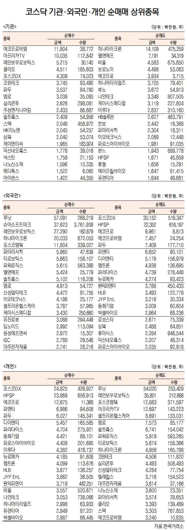 외국인은 루닛(328130)(571억원)을 비롯해 슈어소프트테크(376억원), 레인보우로보틱스(273억원), 하나마이크론(200억원), 포스코엠텍(009520)(118억원), 파마리서치(214450)(60억원), 티로보틱스(117730)(57억원), 파워로직스(047310)(56억원), 엘앤에프(54억원), 솔트룩스(304100)(51억원), 엠로(058970)(49억원), 신성델타테크(065350)(45억원), 이오테크닉스(039030)(42억원) 등을 순매수한 반면 포스코DX(302억원)와 HPSP(224억원), 에코프로(100억원), 에코프로비엠(75억원), 파두(74억원), 피엔티(67억원), 디이엔티(52억원), 펩트론(49억원), 파라다이스(47억원), 뉴로메카(43억원), 원익피앤이(38억원), HLB(35억원) 등을 순매도했다.