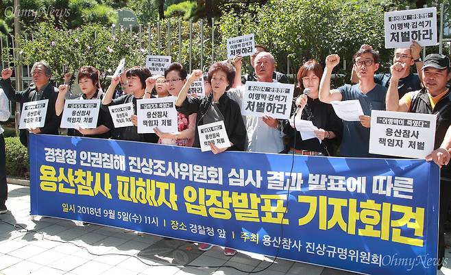 | ▲ 용산참사 유가족과 생존 철거민들이 2018년 9월 5일 오전 서울 서대문구 경찰청 앞에서 기자회견을 열어 경찰청 인권침해사건 진상조사위원회의 권고안에 따른 이명박 전 대통령과 김석기 전 경찰청장의 처벌을 촉구하고 있다. |