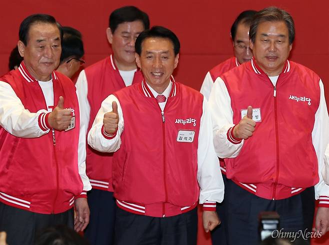 | ▲ '용산참사' 당시 진압 책임자였던 김석기 전 서울지방경찰청장이 2016년 3월 28일 오후 국회 의원회관에서 열린 제20대 총선 공천자대회에서 김무성 대표를 비롯한 공동선대위원장과 기념촬영을 하고 있다. 김 전 청장은 새누리당의 공천을 받고 20대 총선에서 경북 경주에 출마했다. |