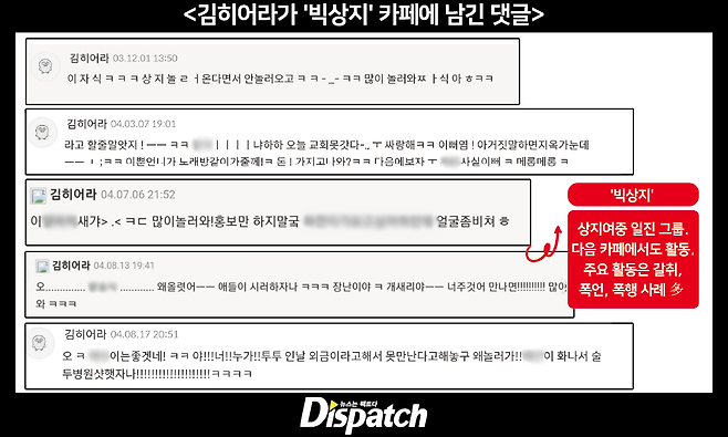 김히어라는 '빅상지'의 멤버였다. '빅상지' 카페에 글을 남기기도 했다. '디스패치'는 그가 카페에 썼던 댓글 등을 확인했다.