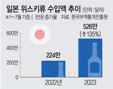 한국무역통계진흥원 자료를 보면 올해 1∼7월 일본 위스키류 누적 수입액은 526만 달러로 전년 동기(224만 달러) 대비 135% 증가했다. 같은 기간 위스키류 수입액 1위 국가인 영국의 수입액 증가율(36.6%)을 3배 이상 웃돌았다. 식품산업통계정보 시장분석에 따르면 주류 카테고리 온라인 검색어 조사에서 일본 위스키인 ‘산토리 위스키’가 지난달 초부터 계속 1위를 차지하고 있다.