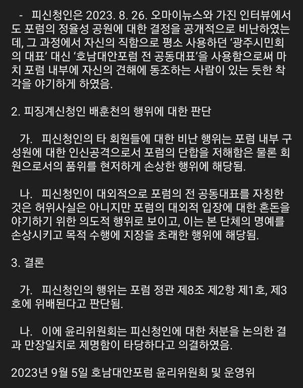 또 "피신청인이 <오마이뉴스>와 한 인터뷰에서 '호남대안포럼 전 공동대표' 직함을 사용한 건 허위사실은 아니지만 마치 포럼 내부에 자신의 견해에 동조하는 사람이 있는 듯한 착각을 야기하게 했다"라며 "이는 본 단체의 명예를 손상시키고 목적 수행에 지장을 초래한 행위에 해당한다"라고 했다.