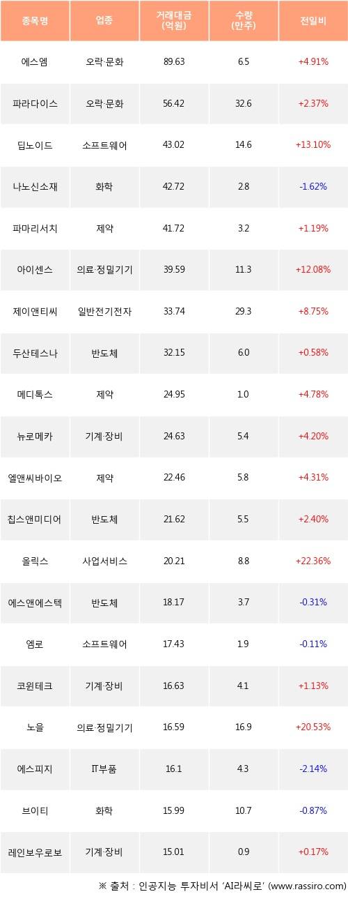 에스엠, 파라다이스, 딥노이드 등은 전일 대비 주가가 상승했고, 나노신소재, 에스앤에스텍, 엠로 등은 주가가 하락했다.
