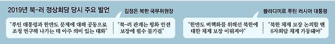 김 위원장과 푸틴 대통령이 처음 만난 2019년 회담에선 핵심 의제가 비핵화나 북한에 대한 체제 안전 보장 등이었지만 12일 열릴 것으로 보이는 2차 정상회담 의제는 크게 다를 것으로 보인다. 우리 정부 당국자는 “당시엔 미국으로부터 뺨 맞은 김정은이 형님 모시듯 푸틴에게 간 거고, 북한이 실질적으로 러시아에 줄 수 있는 것도 없었다”면서 “러시아와 푸틴의 위상도 국제적으로 고립된 지금과 크게 달랐다”고 강조했다.