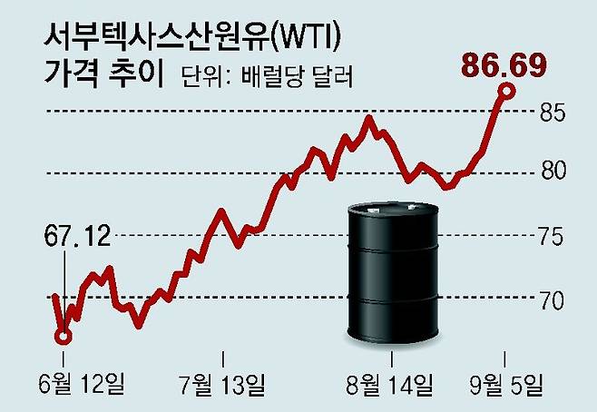 국제유가 급등은 러시아와 사우디아라비아가 당초 예상과 달리 연말까지 하루 100만 배럴 감산을 지속하겠다고 밝히면서 공급 부족 우려가 커진 탓이다. 이와 함께 앞으로 날씨가 추워지면서 난방용 유류 수요도 늘어날 것으로 전망되기 때문에 당분간 국제유가 상승세는 지속될 가능성이 높다. 지난달 물가상승률이 3개월 만에 다시 3%대로 올라선 한국도 인플레이션 압력을 피하지 못할 것으로 보인다.