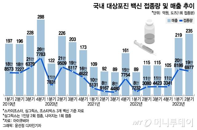분기별 대상포진 백신 접종량을 보면 2019년 2분기 18만7227도즈에서 4분기 26만7783도즈까지 증가했지만 코로나19 발생 직후인 2020년 1분기 11만7831도즈로 급감했다. 이후 2021년 3분기 8만4480도즈까지 줄었다가 올해 들어 1분기 20만8186도즈, 2분기 19만6977도즈로 증가했다.