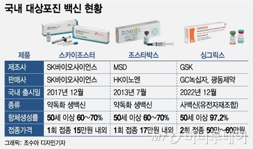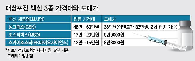 이보다 저렴한 백신으로 1회만 맞아도 되는 '스카이조스터'와 '조스타박스'는 50세 이상이 대상으로 항체생성률은 60~70%로 상대적으로 낮지만 가격이 10만원대로 더 저렴하다. 심평원이 공개하는 비급여진료비 정보를 보면 서울 내 의원급 의료기관에서 스카이조스터 백신을 접종하는 비용은 평균 15만원, 조스타박스는 평균 17만원이다. 제조사에서 공급하는 가격은 8만~9만원 선이다.