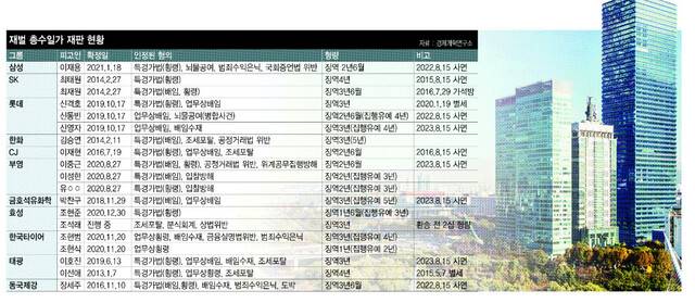 전경련은 범죄를 저지른 총수에게 실형을 주면 또는 경영에서 물러나면 나라가 망한다는 악의적 사실 왜곡의 주역이다. 한 예로 2012년 최태원 에스케이 회장의 횡령 혐의에 대한 검찰 수사 당시 전경련은 기업가 정신 위축이 우려된다는 내용의 탄원서를 냈다. 이런 예는 셀 수 없이 많다. 이는 검찰 출신인 윤석열 대통령이나 기업 범죄 수사에 밝은 한동훈 법무부 장관이 누구보다 잘 알 것이다. 여하튼 이런 논리는 총수만 행복하게 한다. 경제를 살린다는 논리로 이번 광복절 특별사면으로 복권된 이중근 부영그룹 회장은 사면 전 고향 주민·동창 수백명에 최대 1억원까지 현금을 쏘더니 지난주 82살의 나이에 경영 일선에 복귀했다. 이 회장은 지난해 3월 배임·횡령 형기가 만료됐으나 관련 법률에 따라 5년간 취업이 제한됐다가 올해 광복절 특별사면 대상에 포함되면서 취업 제한이 풀렸다.