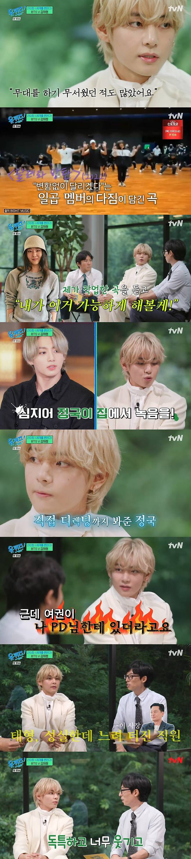 방탄소년단 뷔는 6일 방송된 tvN '유 퀴즈 온 더 블럭'에 출연해 "어떤 무대를 해도 예전의 새로움이 없었다. 무대에 대한 자신감이 없어졌다. 무대를 하기 무서웠던 적도 많았다. 무대를 하고 상을 받는 게 무뎌지고 예전의 감동 기쁨 소중함을 잃어버리게된 것 같았다. 그래서 새로움이 필요했다. 그렇게 탄생한 곡이 '변함없이 달리겠다'는 다짐을 담은 '달려라 방탄'이다. 그래도 이게 내 행복이니까 무뎌진 것들이 다시 바르게 잡히기 시작했다"고 말했다.