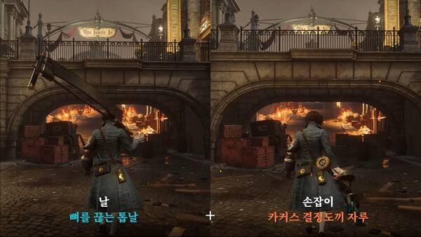 세 번째는 겨울의 레이피어 날(날)과 눈먼 자의 쌍날창 자루(손잡이) 조합이다. 레이피어의 찌르기 공격 방식을 유지하면서 쌍날창 자루의 방패로 방어력을 끌어올린 형태다. 영상에서도 적의 공격을 막아낸 후 빠르게 찌르기로 반격하는 장면이 나온다.