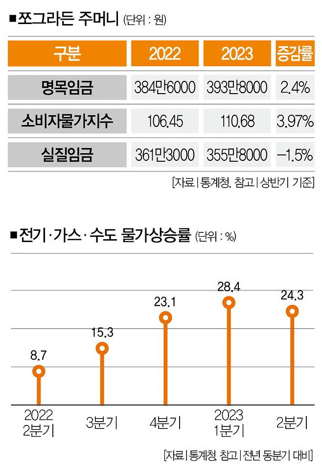 하지만 오른 게 어디 교통요금뿐일까. 전기ㆍ가스ㆍ수도요금도 서민들의 살림살이를 어렵게 하고 있다. 통계에 따르면, 전기ㆍ가스ㆍ수도 소비자물가는 지난해 2분기 8.7% 상승률(전년 동분기 대비)을 기록한 이후로 고공행진이다. 지난해 3분기 두자릿수(15.3%)를 기록한 데 이어 4분기부턴 20%대 상승률(2022년 4분기 23.1%, 2023년 1분기 28.4%, 2분기 24.3%)을 이어가고 있다.