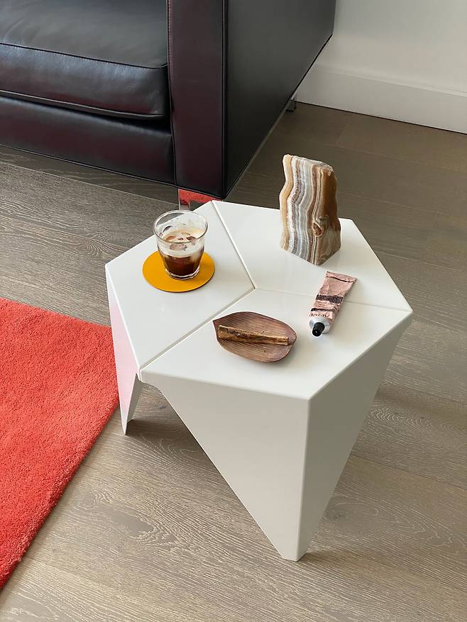 뉴욕에서 가구 쇼핑을 할 땐 샘플 세일을 눈여겨보았다가 득템의 기회를 잡곤 해요. 이사무 노구치의 화이트 프리즈메틱 테이블은 knoll의 샘플 세일에서 아주 저렴한 가격에 데리고 온 보물이죠. 소파 옆에 두고 사이드 테이블로 잘 활용하고 있답니다.