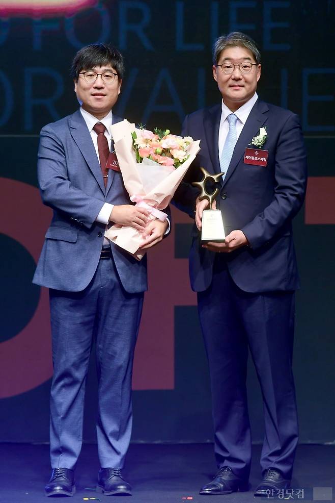 올해의 마스크팩 중국 부문을 수상한 제이준코스메틱(브랜드명 제이준코스메틱) 고병철 대표이사(오른쪽)가 강형빈 인민일보 인민망 한국지사 국장과 포즈를 취하고 있다.