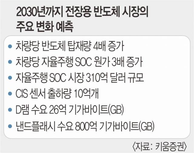 반도체 기업들도 자동차를 겨냥하고 있다. 자율주행 지원 등 여러 가지 편의 기능을 고도화하려면 차량이 처리하는 데이터 양이 방대해진다. 메모리반도체 역할이 중요해질 수밖에 없다. 키움증권에 따르면 2030년까지 차량당 반도체 탑재량은 4배 증가할 것으로 추산된다. 현재 차량 1대에 들어가는 반도체는 200~300개 수준이다. 2030년이면 차량 1대에 반도체만 1000여개가 투입되는 셈이다. IHS마킷은 지난해 기준으로 전 세계 차량용 반도체 시장의 규모가 680억 달러를 넘어섰고, 2029년 말까지 1430억 달러로 배가량 늘어난다고 내다봤다.