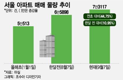 7일 부동산정보제공업체 '아실(아파트 실거래가)'에 따르면 이날 기준 서울 아파트 매매 물량은 7만3117건으로 한 달 전(6만5898건)에 비해 10.95% 증가했다. 한 달 새 7000건 이상 매물이 늘어난 것이다. 올해 초(5만513건)와 비교하면 44.75% 급등한 수준이다.