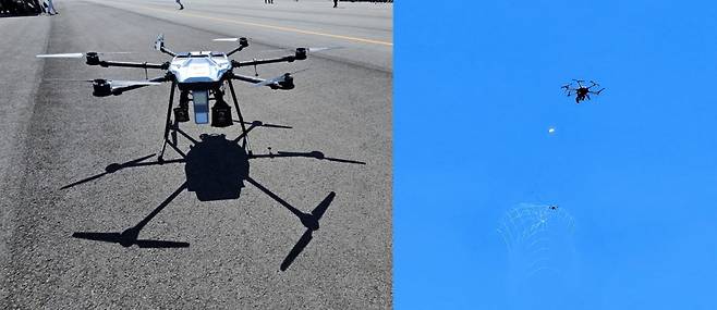 엑서지솔루션스, '안티드론 시스템' 시연회에서 드론헌터 포획 선보여