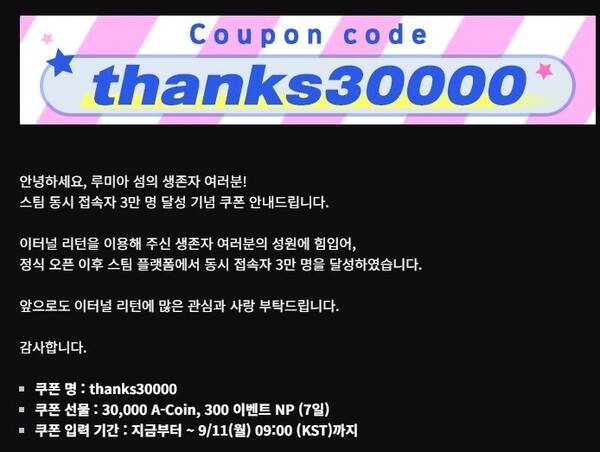 개발진은 "스팀 동시 접속자 3만 명 달성 기념 쿠폰을 안내한다. 이터널 리턴을 이용해 준 유저들의 성원에 힘입어 정식 오픈 이후 스팀 플랫폼에서 동시 접속자 3만 명을 달성했다. 앞으로도 이터널 리턴에 많은 관심과 사랑 부탁한다"고 전했다.