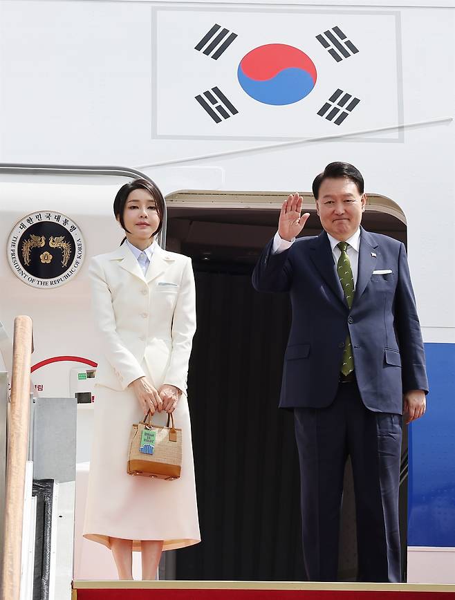 | ▲ 아세안(ASEAN·동남아시아국가연합) 관련 정상회의와 주요 20개국(G20) 정상회의 참석 등을 위해 인도네시아와 인도를 순방하는 윤석열 대통령과 부인 김건희 여사가 5일 성남 서울공항에서 출국하며 전용기인 공군 1호기에 올라 환송객을 향해 손을 흔들고 있다. |
