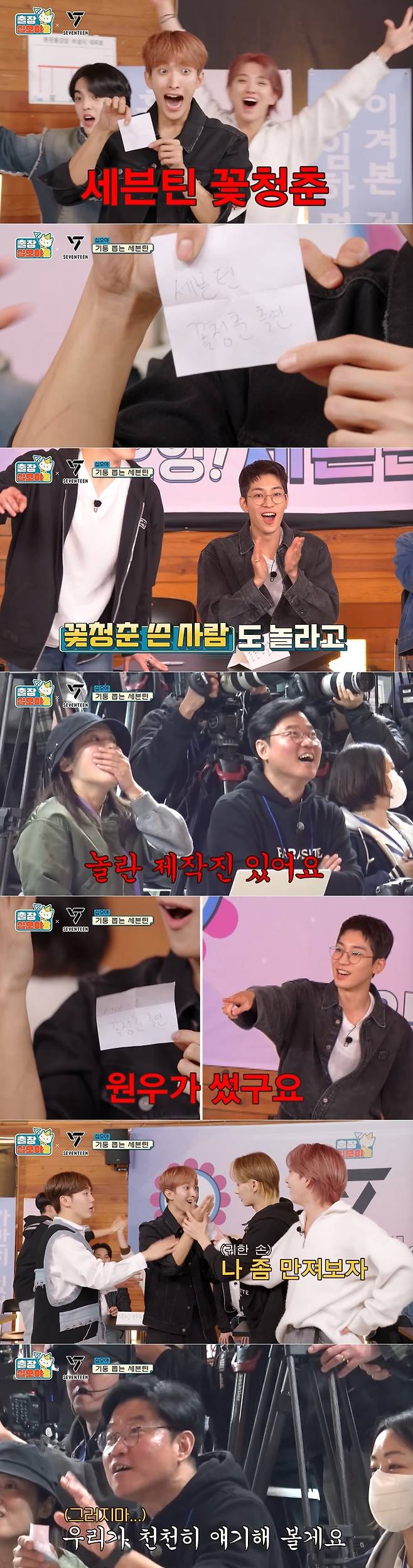 세븐틴 멤버들은 즉각 환호했다. 반면 나영석 PD, 신효정 PD를 필두로 한 제작진은 경악했다. 나영석 PD는 "이거 뭐 진짜야? 누가 쓴 거야?"라며 "소속사랑 얘기를 해야.. 이거 돈 많이 들겠는데. 13명 '꽃청춘' 와.. 관광 버스를"이라고 말했다. 신효정 PD는 "(13명을) 속이는 게 더 문제다"고 밝혔다.