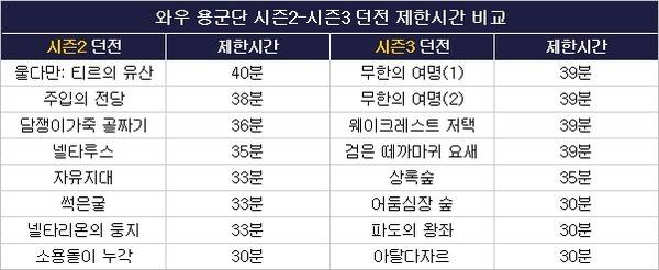 중간값인 35분 던전 '상록숲' 역시 지난 시즌과 비교하면 상위권에 속한다. 대신, 최소 제한시간인 30분짜리 던전이 3개나 된다. 30분에서 40분까지 골고루 분배됐던 지난 시즌2와 비교하면 굉장히 극단적인 모습이다.