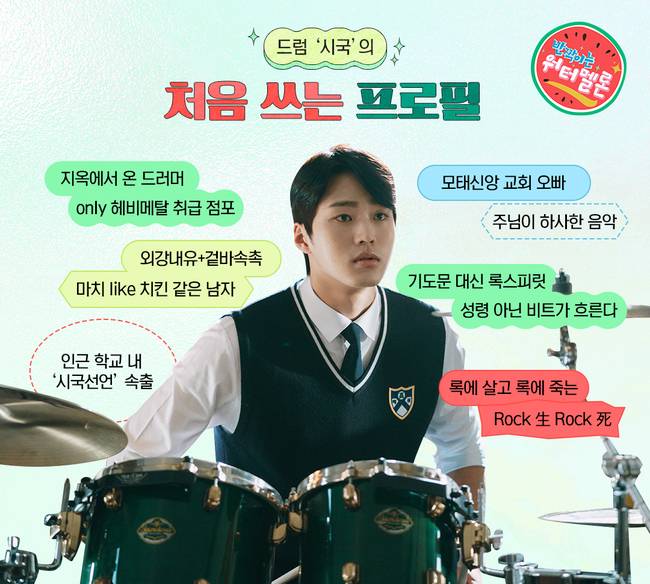외강내유, 겉바속촉(겉은 바삭, 촉은 촉촉의 줄임말)의 대명사 시국(이하민 분)은 모태신앙이라는 수식어가 무색하게 그의 핏속에는 성령 대신 비트가 흐르는 터. 록에 살고 록에 죽는 ‘록생록사’에 오직 헤비메탈만 추구해 ‘지옥에서 온 드러머’라는 별명이 붙어 있다. 강렬한 비트와 상반된 여린 면모 등 시국의 반전 매력은 시청자에게 ‘시국선언’을 유발한다.