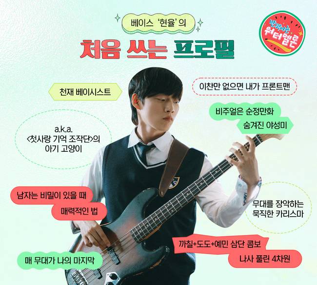 ‘첫사랑 기억 조작단’에 기타 천재 은결이 있다면 베이스에는 현율(윤재찬 분)이 있다. 까칠하고 예민한 면모를 가지고 있지만 밴드에 대한 애정만은 넘치는 현율은 매 무대마다 인생의 마지막처럼 열정을 쏟는다. 나사 풀린 사차원처럼 무방비한 얼굴 뒤에는 무언가 수상한 기색도 있어 천재 베이시스트 현율의 내면이 궁금해진다.
