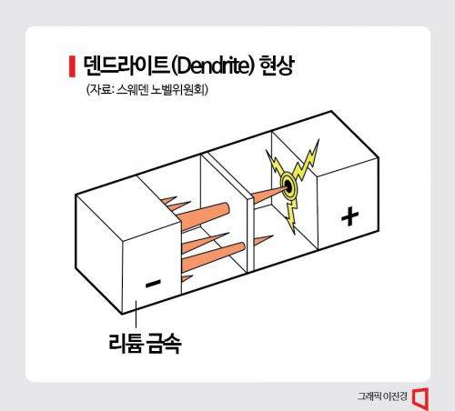 리튬 금속을 음극에 사용할 경우 충전 시 음극으로 이동한 리튬이온이 전자와 결합할 때 안정적으로 자리 잡지 못하고 나뭇가지처럼 뾰족하게 자라는 현상이 발생했다. 이것을 덴드라이트(Dendrite)라고 부른다. 이 날카로운 리튬이 분리막을 뚫을 정도로 자라면 음극과 양극이 만나 단락(short, 쇼트)이 발생해 폭발로 이어진다. 당시 휘팅엄 박사의 실험실에선 여러 차례 폭발이 일어나 소방관들이 자주 출동했다는 일화가 전해질 정도다.