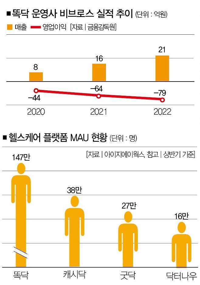 똑닥의 경영 실적을 보면 설득력이 없지 않은 말이다. 똑닥 운영사 비브로스의 지난해 매출은 21억원, 영업이익은 -79억원이었다. 2021년에도 매출은 16억원에 불과했는데, 적자는 64억원에 달했다. 늘어난 가입자를 수익으로 연결하진 못한 거다.
