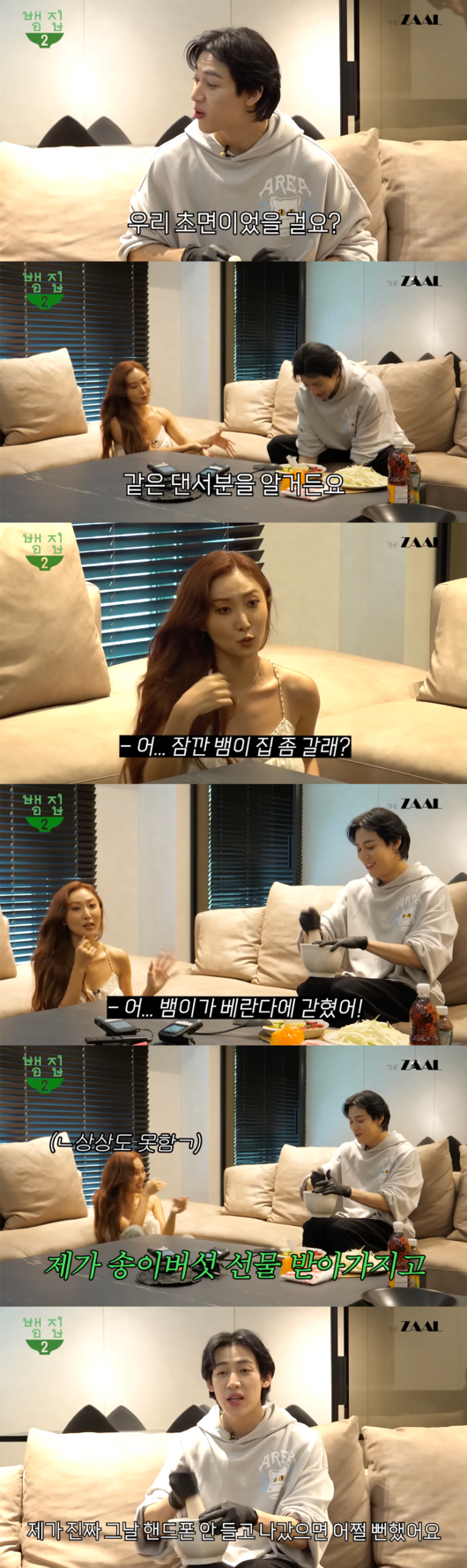 화사는 “제가 뱀뱀 씨의 집을 처음으로 갔다. 같은 댄서 분을 아는데, 갑자기 연락이 와서 ‘잠깐 뱀이 집을 좀 갈래?’했다. 뱀이 베란다에 갇혔다고 문 열어달라고 하더라. 도어락을 열고 침실에 들어갔다. 그때 베란다에 계시더라”고 이야기했고, 뱀뱀은 “통화가 아니라 버섯 구워먹어서 그랬다. 송이버섯을 선물 받아서 ‘쉬는 날이니까 먹어야지’ 했는데 그 집이 문 닫으면 안 열린다”고 말했다.