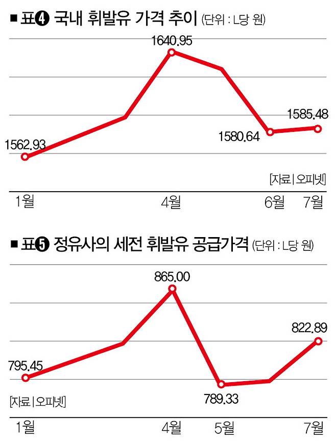얼핏 비슷해 보이지만 이상한 점이 있다. 국제 원유 가격이나 국제 휘발유 가격보다는 상승세가 가파르고, 하락세는 완만했다는 점이다(표➍). 특히 5월의 국제 원유 가격이나 국제 휘발유 가격은 예외 없이 1월보다 훨씬 낮은 가격으로 형성돼 있다. 하지만 국내 휘발유 가격은 3월 가격 수준에 머물렀다.