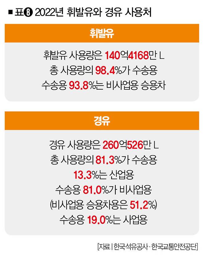 한국석유공사에 따르면 2022년 기준 국내 총 휘발유 사용량은 140억4168만L, 총 경유 사용량은 260억526만L다. 휘발유의 98.4%(138억1747)가 수송용(도로)으로 사용됐고, 수송용의 93.8%가 비사업용 승용차에 사용됐다(표➑).[※참고: 수송용의 쓰임새는 한국교통안전공단의 '자동차주행거리 통계'를 적용해 분석했다.]