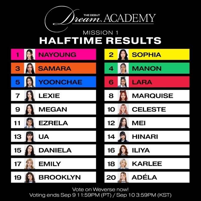 하이브는 게펜 레코드와의 합작 글로벌 걸그룹 프로젝트 ‘더 데뷔: 드림아카데미’ 첫 번째 위버스 팬 투표와 공식 채널 ‘좋아요’ 중간 집계 결과(한국시간 8일 오후 4시 기준)를 9월 9일 공개했다.