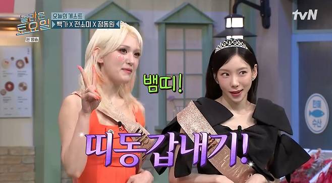 태연과 전소미는 "저희는 내기 내기 동갑내기 띠동갑내기 뱀띠"라며 "심지어 생일도 같다"고 강조했다.