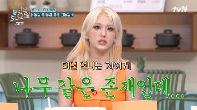 그러자 전소미는 “태연 언니는 나에게 나무 같은 존재다. 보통 열 번 찍으면 넘어오는데 언니는 좀 어려운 나무다”라고 털어놨다.