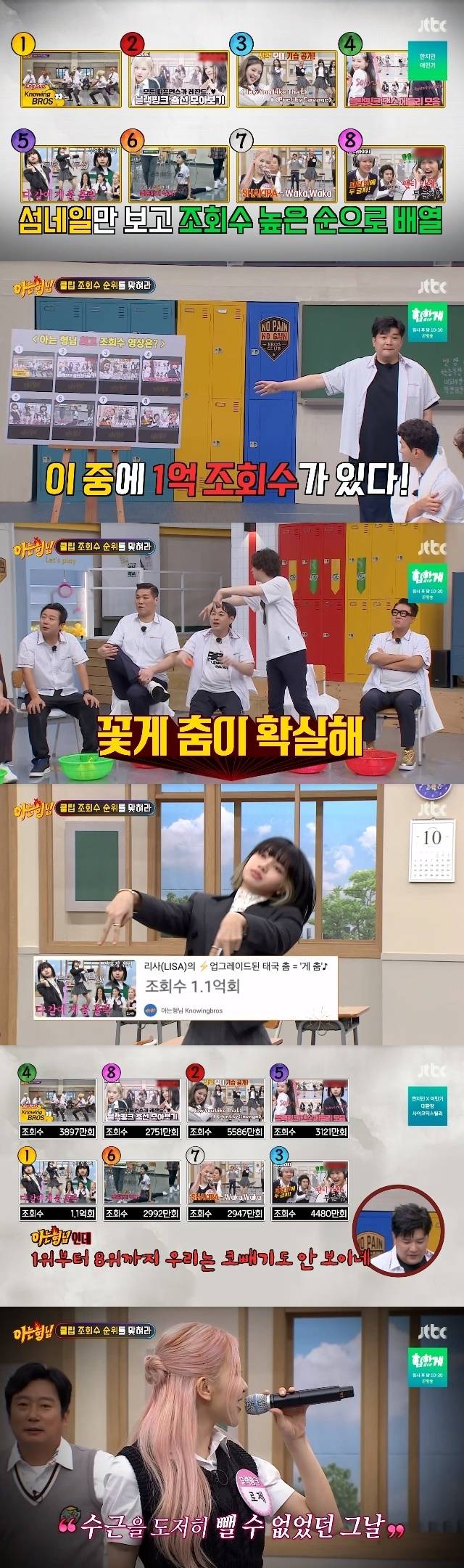 이날 형님들은 섬네일만 보고 조회수 높은 순으로 클립을 배열해야 했다. BTS의 'DNA' 공개부터, 블랙핑크 춤선 모아보기, 블랙핑크 신곡 무대 기습 공개, 블랙핑크 댄스 메들리 모음, 블랙핑크 리사의 꽃게 춤, 트와이스의 다리 찢기, 블랙핑크 로제의 샤키라 솔로곡, 엑소의 '팬티 안의 두 글자'까지 총 8개의 클립이 후보였다.