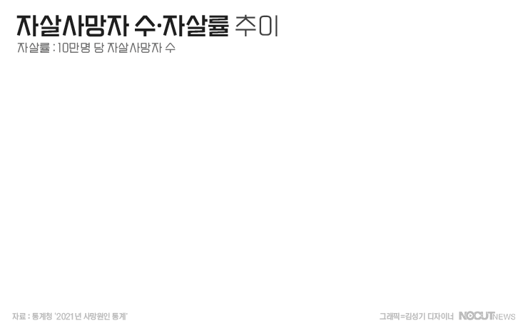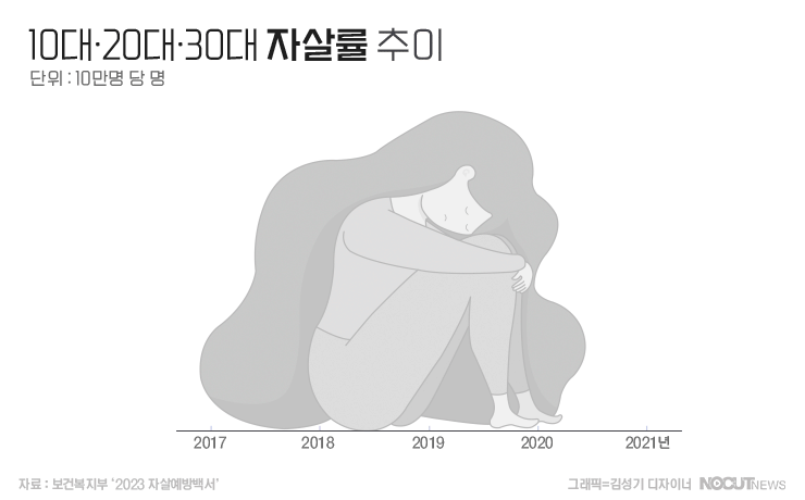 자살률은 2010년부터 감소하는 추세이지만 10~30대의 자살률은 지속적으로 증가한다는 특징을 보이고 있습니다. 10·20대의 자살률이 지난 2017년 4.7명, 16.4명에서 2021년에 각각 7.1명, 23.5명으로 늘었고 30대의 자살률도 그사이 24.5명에서 27.3명으로 증가했습니다.